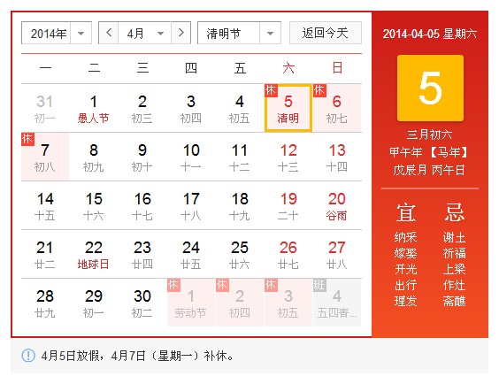 4月5日(星期六,清明节)放假,4月7日(星期一)补休。放假期间若给您带来不便,敬请谅解!