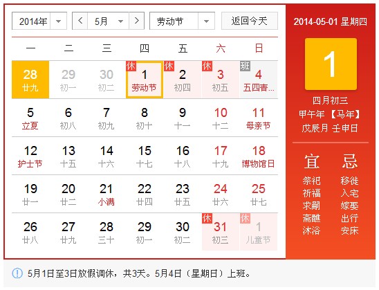 5月1日(星期四,劳动节)至3日(星期六)放假调休,共3天。5月4日(星期日)上班。放假期间若给您带来不便,敬请谅解!