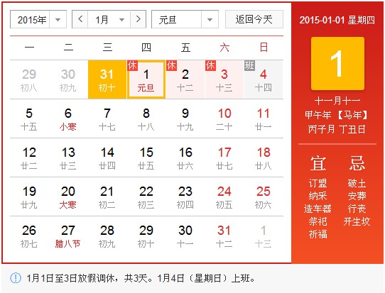 1月1日(元旦,星期四)至3日放假调休,共3天。1月4日(星期日)照常上班。放假期间若给您带来不便,敬请谅解!