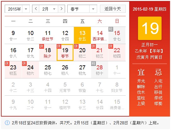 2月18日至24日放假调休,共7天。2月15日(星期日)、2月28日(星期六)照常上班。放假期间若给您带来不便,敬请谅解!