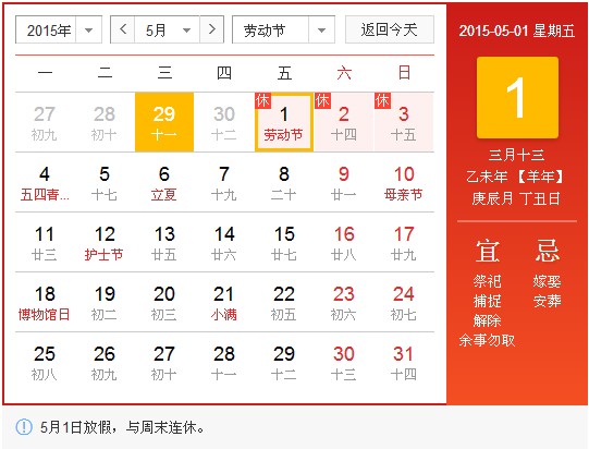 5月1日(劳动节,星期五)至5月3日(星期日)放假,共3天。5月4日(星期一)照常上班。放假期间若给您带来不便,敬请谅解!