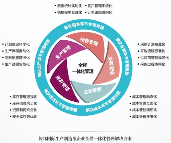 以智邦国际生产制造行业一体化管理解决方案为例,该方案基于企业对生产过程信息化控制和上下游信息整合的需求,将整个生产过程有机结合在一起,通过协同化、自动化、精细化的流程管理,使企业能够有效地优化资源配置、提高生产效率、降低生产成本,从而实现企业效益最大化,推动企业持续快速发展。
