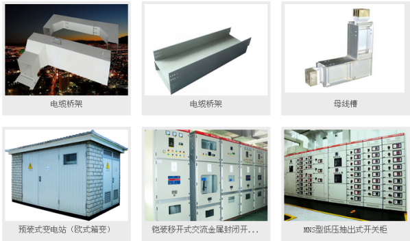 公司研发生产高压产品系列包括:SF6系列充气开关柜、XGN15-12型封闭环网开关设备、KYN28A-12型铠装移开式交流金属封闭开关设备、XGW-12/24户外开闭所、ZGS型组合式变压器(美式箱变)、YB口(或ZBW)型预装式变压站(欧式箱变)。低压产品系列包括:母线槽CMC系列,软连接。低压抽屉开关柜,MNS、GCK、GCK(GCL),固定式开光柜;GGD、PGL。各式配电箱及电缆架桥架。