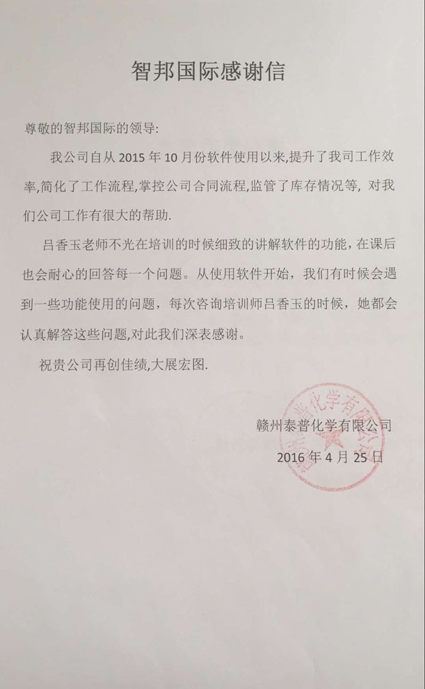 智邦国际是中国企业管理软件领军企业,10多年来,以独特、完备的服务理念快速响应客户需求,为企业提供全生命周期的服务,成为广大企业的选择。了解到江西赣州泰普化学有限公司的业务特点和管理需求后,智邦国际工程师第一时间为其部署了一套ERP软件。