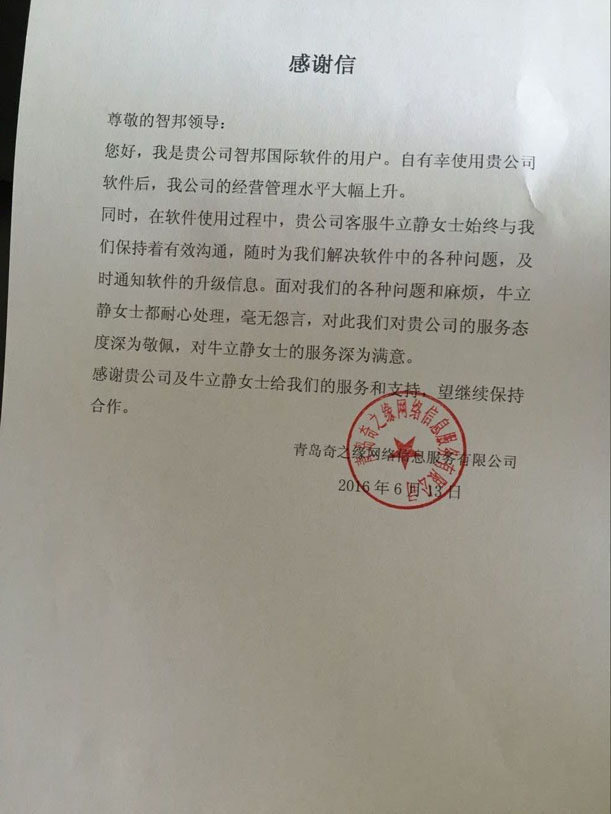 近年来,随着发展脚步的加快,客户量和业务量越来越多,为了保障客户利益,实现所有客户统一管理,管理层决定引入最新的管理理念,经过一番对比试用,最终,山东青岛奇之缘网络信息服务有限公司决定与智邦国际合作。