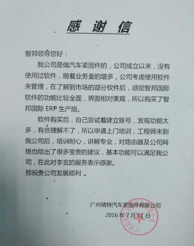 广东广州精特汽车紧固件有限公司感谢信