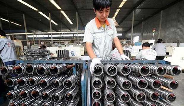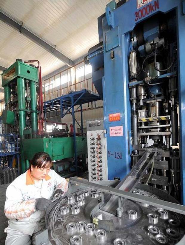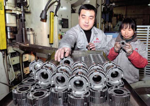 凯华齿轮有限公司工人在自动机械压机生产线检查汽车变速箱同步器齿轮