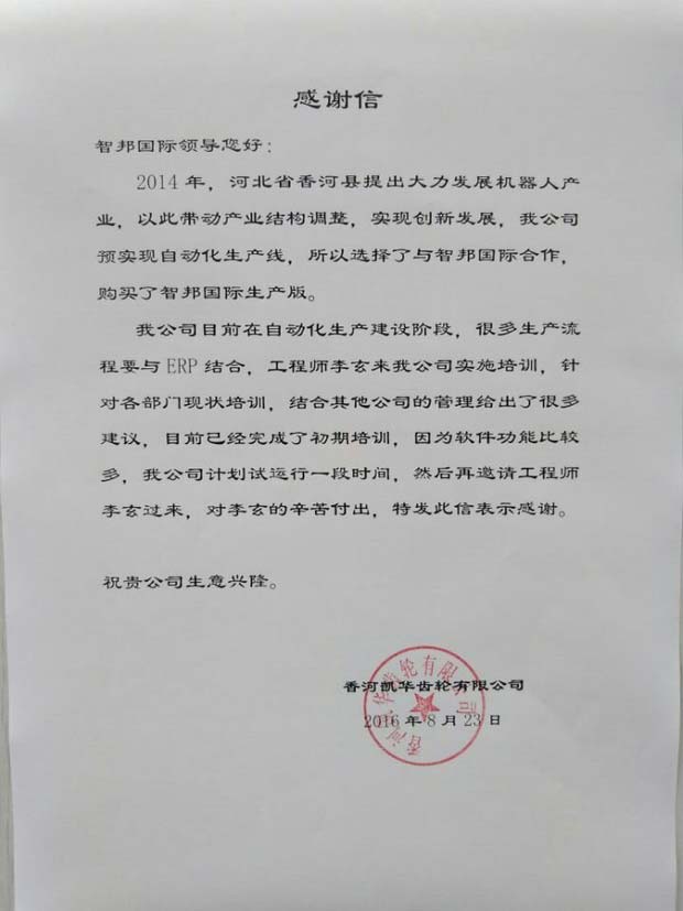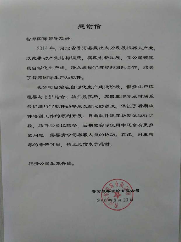 河北香河凯华齿轮有限公司感谢信