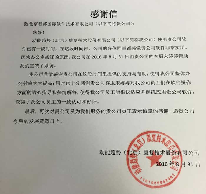 动能趋势(北京)康复技术股份有限公司感谢信