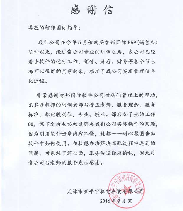企业信息化从本质上讲就是管理的信息化,企业信息化的水平也就是企业管理水平的具体体现。相信在智邦国际ERP系统的协助下,天津亚平宁机电科贸有限公司定能全面提升企业信息化、自动化、一体化管理水平,高效集成、管理和维护各环节数据信息,打造适合企业可持续发展的经营模式,用高效率、高品质、高标准不断为新老客户创造价值。
