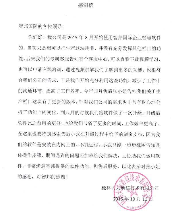 桂林大为通信技术有限公司感谢信