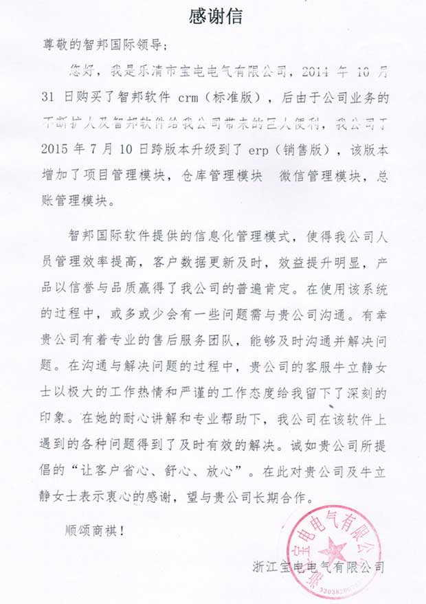 浙江宝电电气有限公司感谢信
