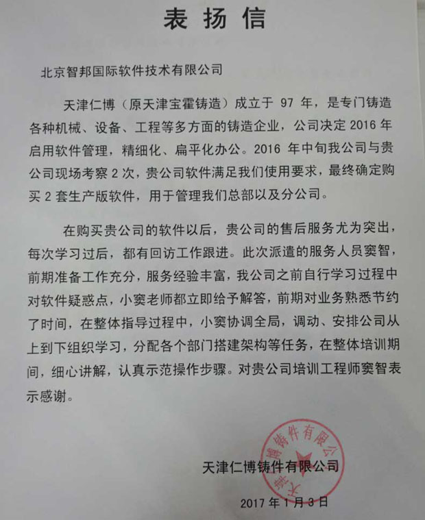 信息时代,唯一不变的就是变化,世界每时每刻都在变化,只有快速适应变化,不断在变化中求生存,才能确保不被淘汰出局。相信在智邦国际ERP系统的协助下,天津仁博铸件有限公司定能用先进科技推动管理创新,用现代管理替代手工作业,精细化、实时化、可视化掌控每个环节,不断提升资源集成、共享、协同能力和效率,在以后的发展中越来越顺利。