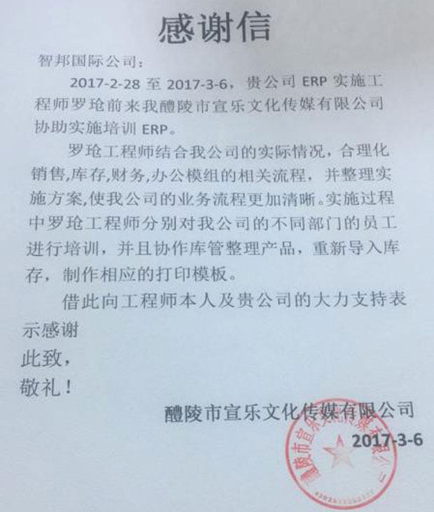 湖南醴陵宣乐文化传媒有限公司智邦国际ERP项目培训现场合影