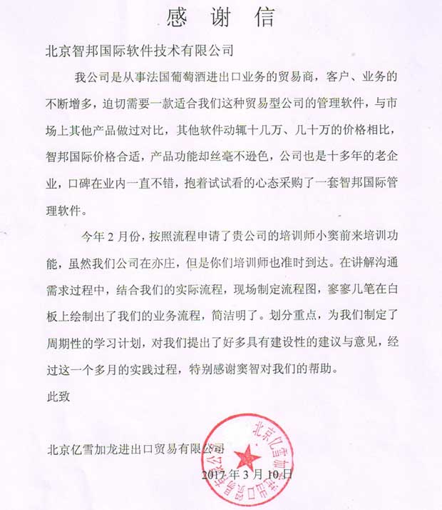 北京亿雪加龙进出口贸易有限公司感谢信