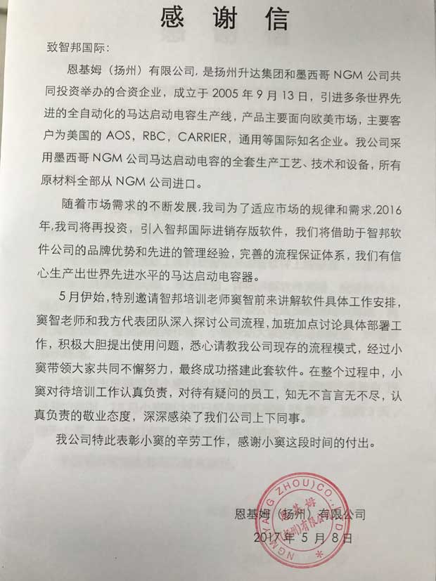 恩基姆(扬州)有限公司感谢信