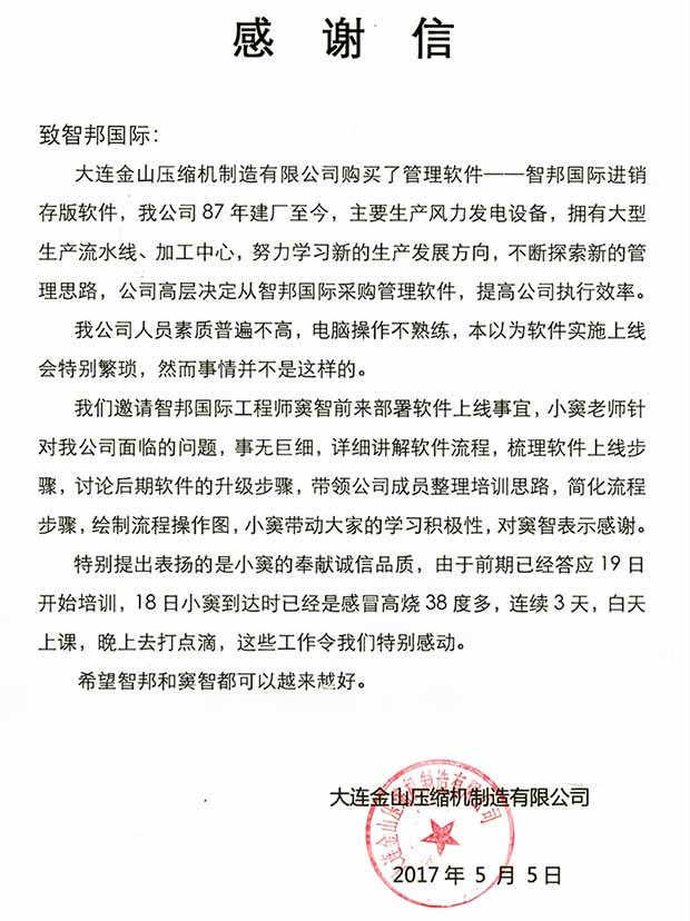 辽宁大连金山压缩机制造有限公司感谢信