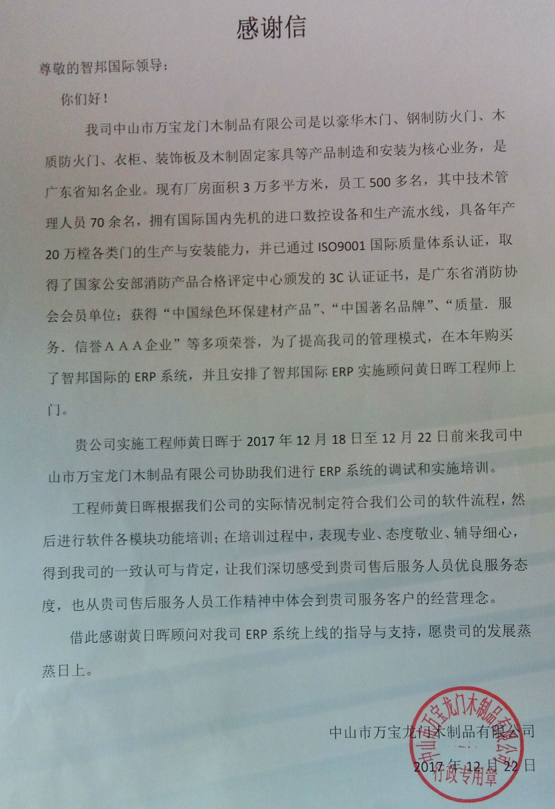 中山市万宝龙门木制品有限公司感谢信