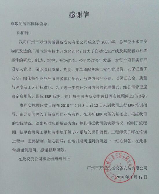 广州市万恒机械设备安装有限公司感谢信