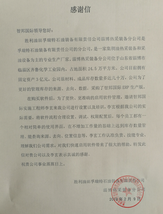 随着胜利油田孚瑞特石油装备有限责任公司淄博热采装备分公司多年的发展壮大,企业得到迅速发展,在生产、采购、库存、财务等管理上,需要统筹信息化快捷管控,经过功能、软件商资质等层层筛选,最终决定与智邦国际合作,协助企业实现现代信息化管理。在了解客户情况后,智邦国际实施工程师立即根据情况制定了实施方案,为其部署了智邦国际ERP系统。