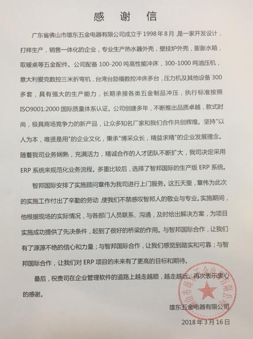 随着佛山市雄东五金电器有限公司的发展,其产品系列和业务规模逐渐壮大,客户、生产、采购等管理难度加大,管理层决定通过信息化管理软件的应用,提高协同办公能力,实现科学高效无纸化办公。最终,通过功能、服务、软件商资质等多方面综合对比,与智邦国际达成合作;在了解客户情况后,智邦国际实施工程师立即根据其情况制定了实施方案,为其部署了智邦国际ERP系统。