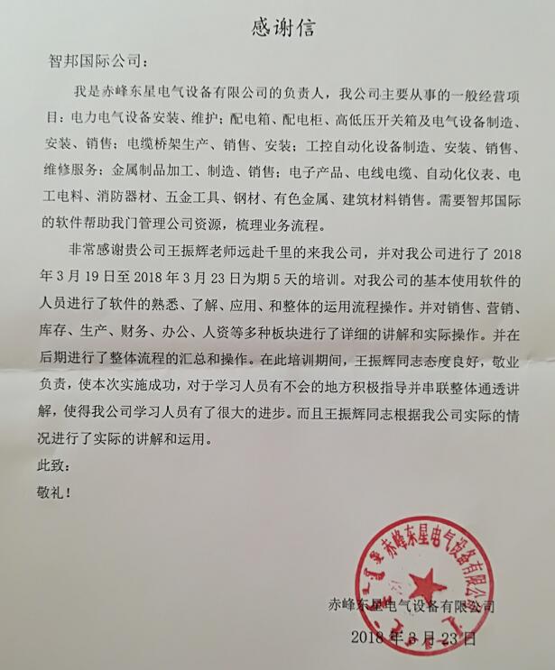 赤峰东星电气设备有限公司感谢信