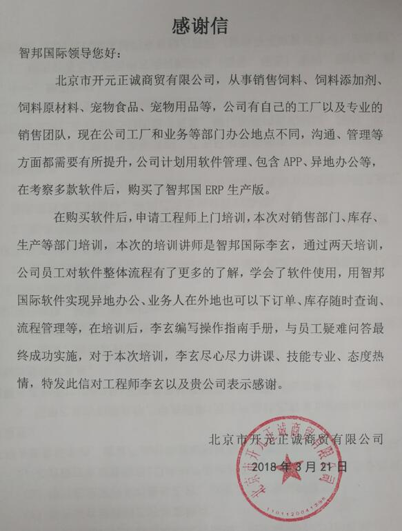 随着北京市开元正诚商贸有限公司多年的发展,其产品系列和业务规模逐渐壮大,生产、销售、库房、内勤等管理难度加大,管理层决定通过信息化管理软件的应用,提高协同办公能力,实现企业科学高效无纸化办公;最终,通过功能、服务、软件商资质等多方面综合对比,与智邦国际达成合作;在了解客户情况后,智邦国际实施工程师立即根据详情制定了实施方案,为其部署了智邦国际ERP系统。