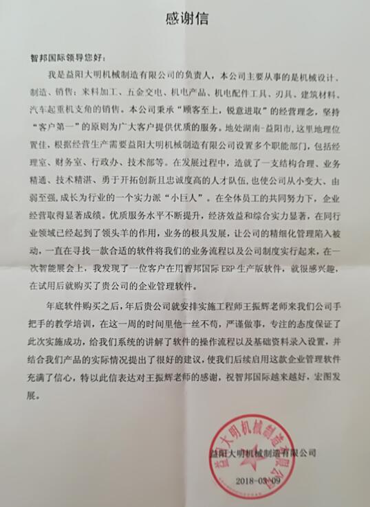随着益阳大明机械制造有限公司十多年在行业的耕耘,业务迅速增长,团队发展壮大,管理层意识到传统的办公方式已经不能胜任企业管理,因此决定上一款信息化管理系统;经过功能、软件商资质等层层筛选,最终决定与智邦国际合作,协助实现现代信息化管理;在了解客户情况后,智邦国际实施工程师立即根据详情制定了实施方案,为其部署了智邦国际ERP系统。