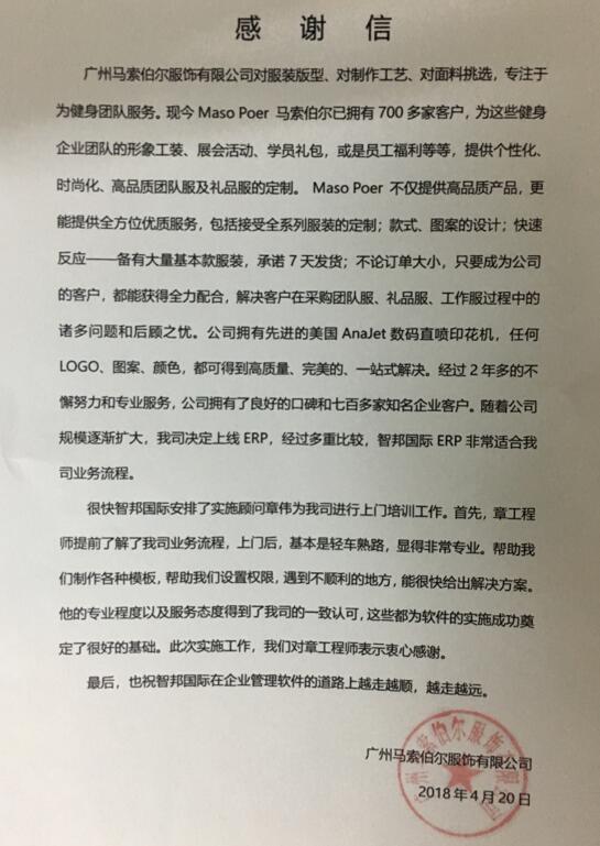 广州马索伯尔服饰有限公司感谢信