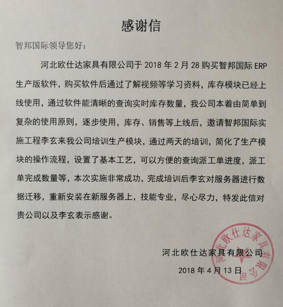 随着河北欧仕达家具有限公司的发展,客户群扩大,业务量增多,仓储以及采购的管理,已经不是传统办公方式所能胜任,为了实现内部快捷高效办公,公司管理层决定上一套信息化管理系统;经过功能、软件商资质等层层筛选,最终决定与智邦国际合作,协助企业实现科学信息化管理;在了解客户情况后,智邦国际实施工程师立即根据其情况制定了实施方案,为其部署了智邦国际ERP系统。