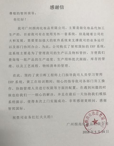 随着广州颜尚化妆品有限公司的发展,生产、仓储、质检等管理环节急迫需要变革,管理层决定上一款信息化管理软件,实现信息化管控;经过功能、软件商资质等层层筛选,最终决定与智邦国际合作,协助实现科学信息化管理;在了解客户情况后,智邦国际实施工程师立即根据其情况制定了实施方案,为其部署了智邦国际ERP系统。