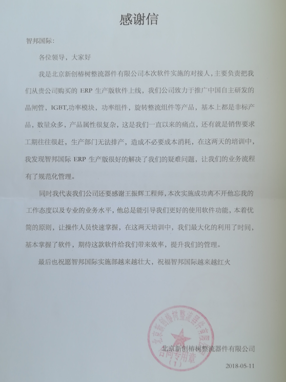 北京新创椿树整流器件有限公司智邦国际ERP系统实施现场