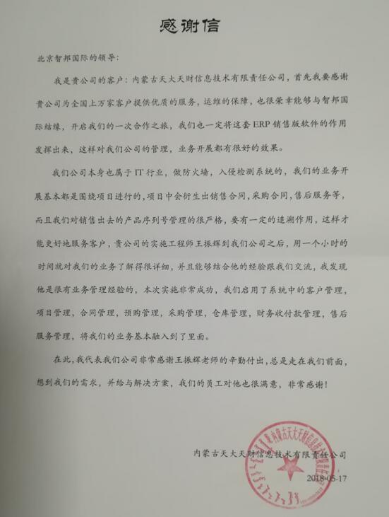 效率就是金钱,而效率的关键就是工作流程的规范和工作方式的便捷。相信在智邦国际ERP系统的协助下,内蒙古天大天财信息技术有限责任公司定能实现客户、项目等信息一体化高效管控,助力企业科学发展。