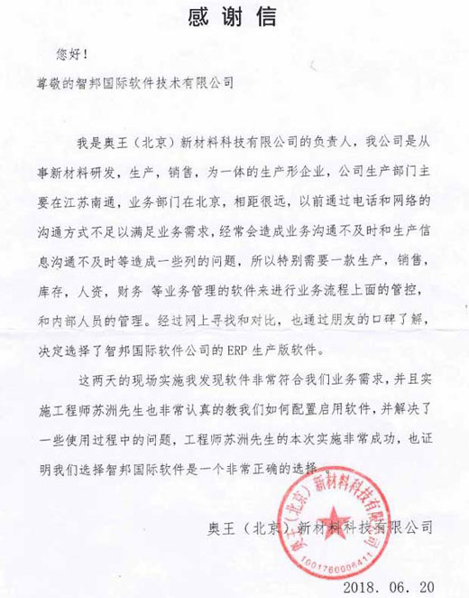 获奥王(北京)新材料科技有限公司书面致谢