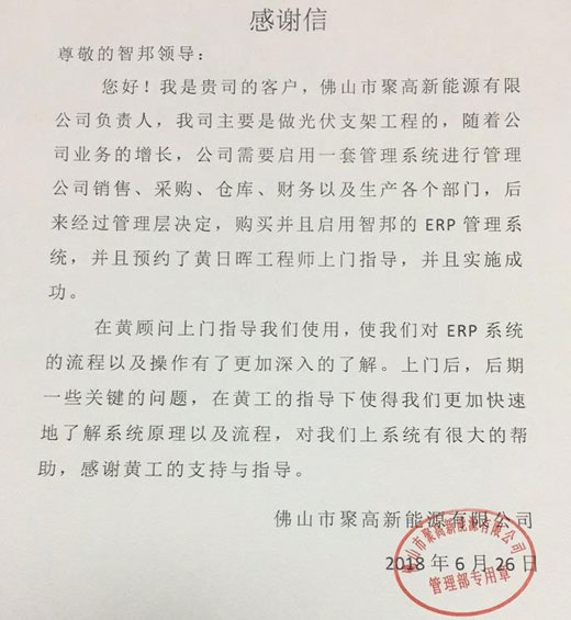 获佛山市聚高新能源有限公司书面致谢