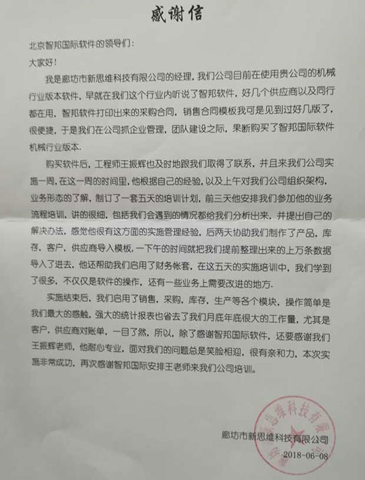 获廊坊市新思维科技有限公司书面致谢