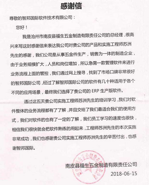 获南皮福生五金制造有限责任公司书面致谢