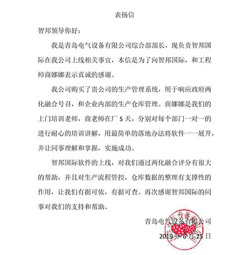 青岛电气设备有限公司智邦国际ERP系统感谢信