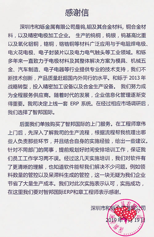 深圳市和铄金属有限公司智邦国际ERP系统感谢信