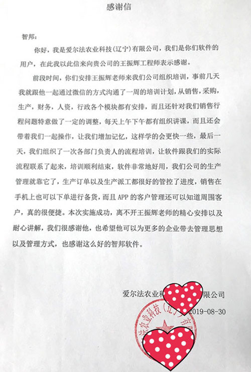 爱尔法农业科技(辽宁)有限公司智邦国际ERP系统感谢信