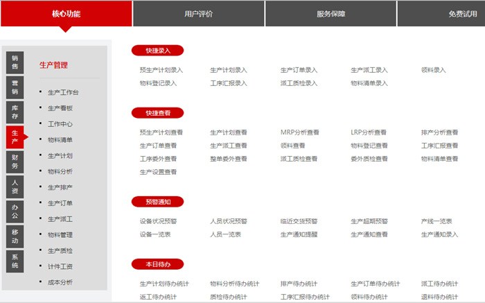 在生产工作台中有九大录入功能模块,可快捷录入预生产计划、生产计划、生产订单直到派工质检、物料清单等的录入。