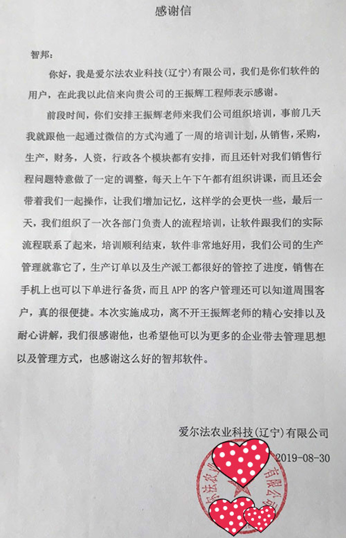 爱尔法农业科技(辽宁)有限公司智邦国际ERP系统感谢信