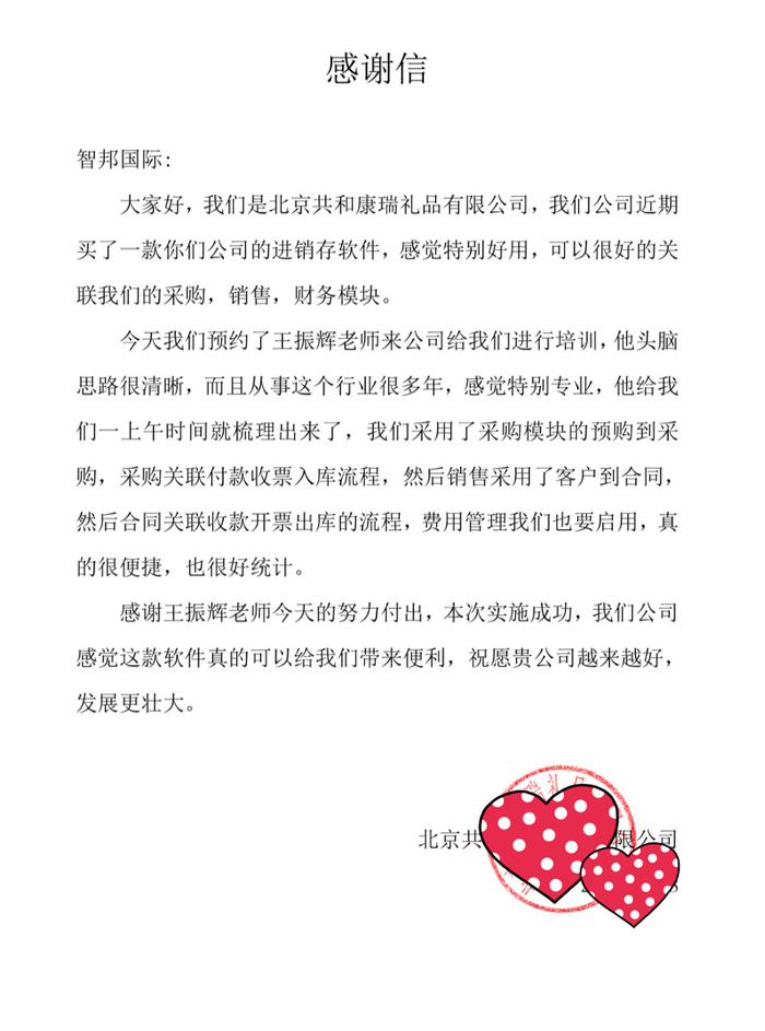 北京共和康瑞礼品有限公司智邦国际进销存系统感谢信
