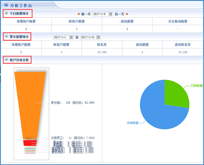 二、借助于微信平台,各商家可以发布营销和推广信息、也可以发布自己的商品。由此可见,微信商城存在巨大的商机。因此智邦国际ERP系统销售版打造智能化微信管理,将其分为2个部分,第一部分功能是微信粉丝的获取、跟进、转客户功能;第二部分是微信粉丝浏览商品、下单的功能。在分析工作台可以查看“今日数量统计”“累计数量统计”“用户分布分析”。通过强大的数据分析,洞悉产品推广、发展的内在规律,从而及时明确下一步的战略重点和方向。