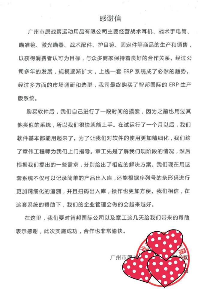 广州市原战素运动用品有限公司智邦国际ERP系统感谢信
