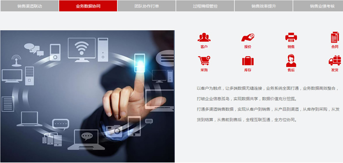 智邦国际工程师在详细了解了企业管理所需之后,为其推荐了智邦国际ERP系统销售版。系统可以通过数据集成智能化帮助企业把握商机,快速发展新客户、用心维护老客户、实时响应客户需求,提高客户服务品质及满意度,从而保持销售成交量的增长及企业竞争力的提升。