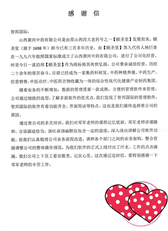 山西黄河中药有限公司智邦国际ERP系统感谢信