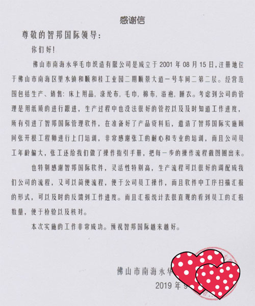 佛山市南海永华毛巾织造有限公司感谢信