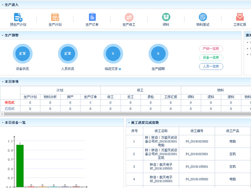 一、为了方便生产人员和管理层能够在一个页面中完成生产操作、提醒、查看和分析等相关所有操作,提高工作效率,智邦国际ERP系统生产版提供了生产工作台功能。工作台包含5部分信息:生产进入、生产预警和通知;待完成和已完成事项;设备、人员状态和派工单进度完成指数;进度追踪报表、物料报表、次品率分析和成本分析等常用报表。通过一个页面为企业内部人员实时呈现生产相关事宜,实时监控生产全流程,只需一键快捷添加各类生产数据,即可将整个生产车间迁移到系统中。线上工作台协助业务人员实时掌控生产全程,信息化管控助力管理层精准决策,实现业务人员高效工作,产品高质出厂。