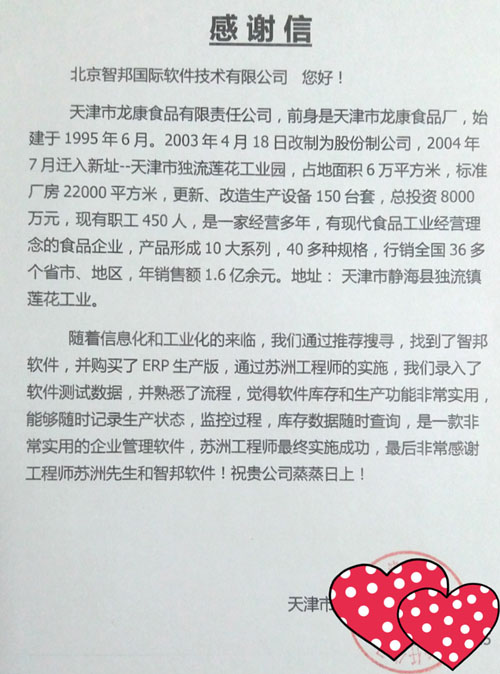 天津市龙康食品有限责任公司智邦国际ERP系统实施现场
